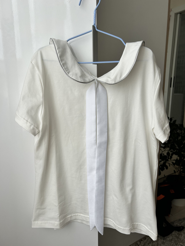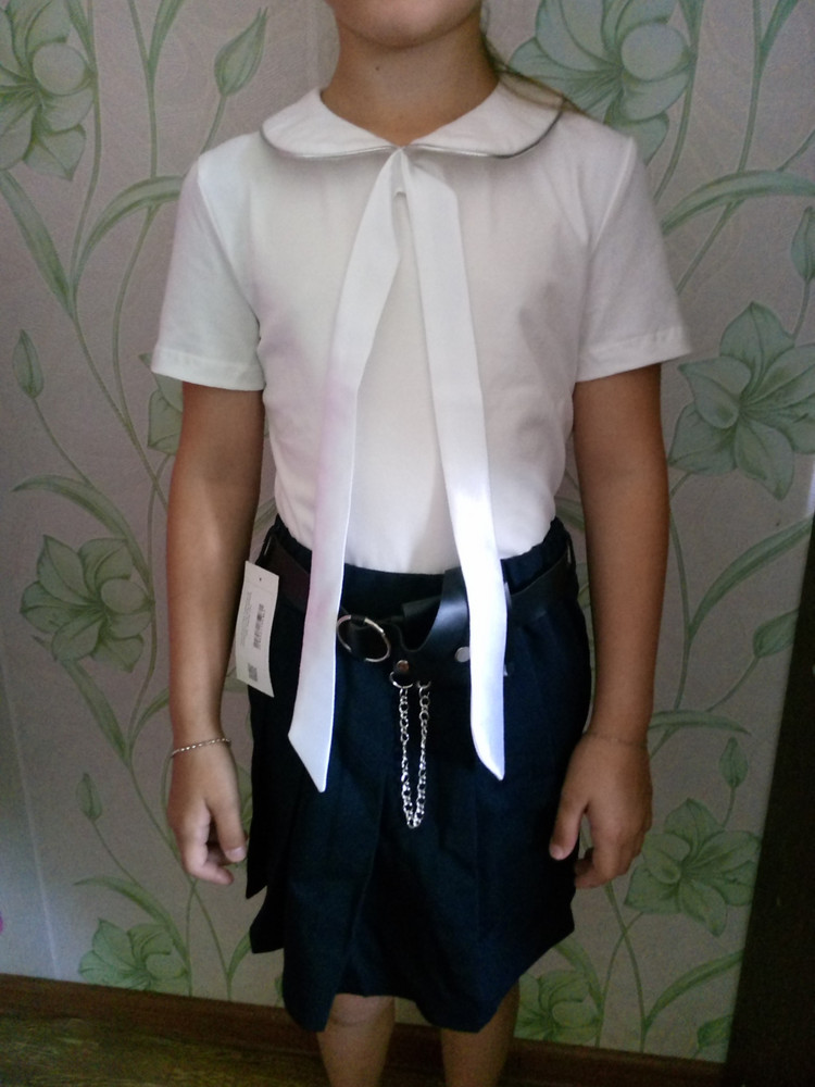 Приталенный силуэт подчёркивает фигуру и выглядит опрятно в составе школьной формы. Короткий рукав обеспечивает комфорт в помещении и в тёплое время года. Модель легко комбинируется с классическими юбками, сарафанами, брюками и жилетами, а также может стать основой праздничного наряда.